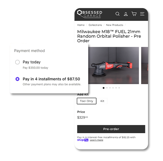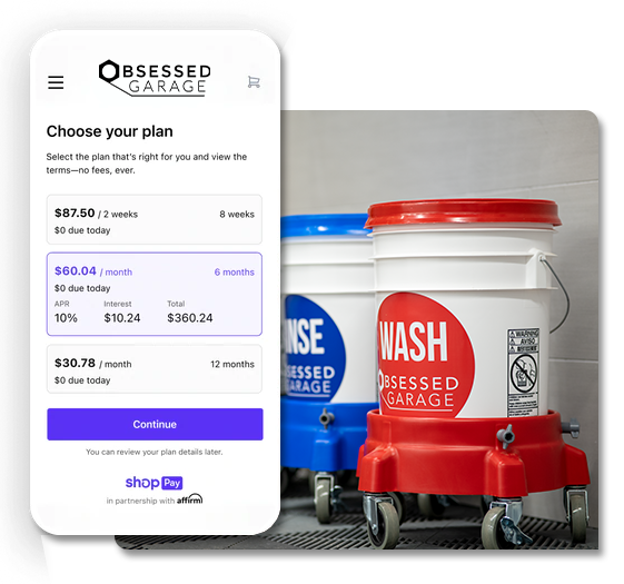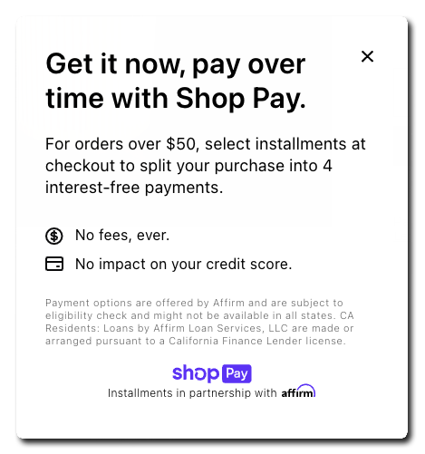 Order from $50 - $999.99 qualify for four easy interest free Bi-weekly payment program. Orders of $1000 - $17,500 can qualify for a monthly interest-bearing installments, and may be paid in three, six, or twelve months depending on purchase amount. Financing provided via Affirm.*